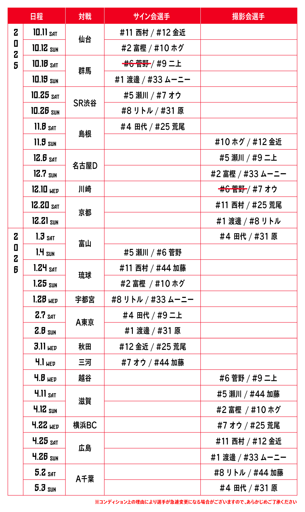 ・選手参加イベントについては各選手のコンディション上の理由により急遽日程変更になる場合がございますので、あらかじめご了承ください。