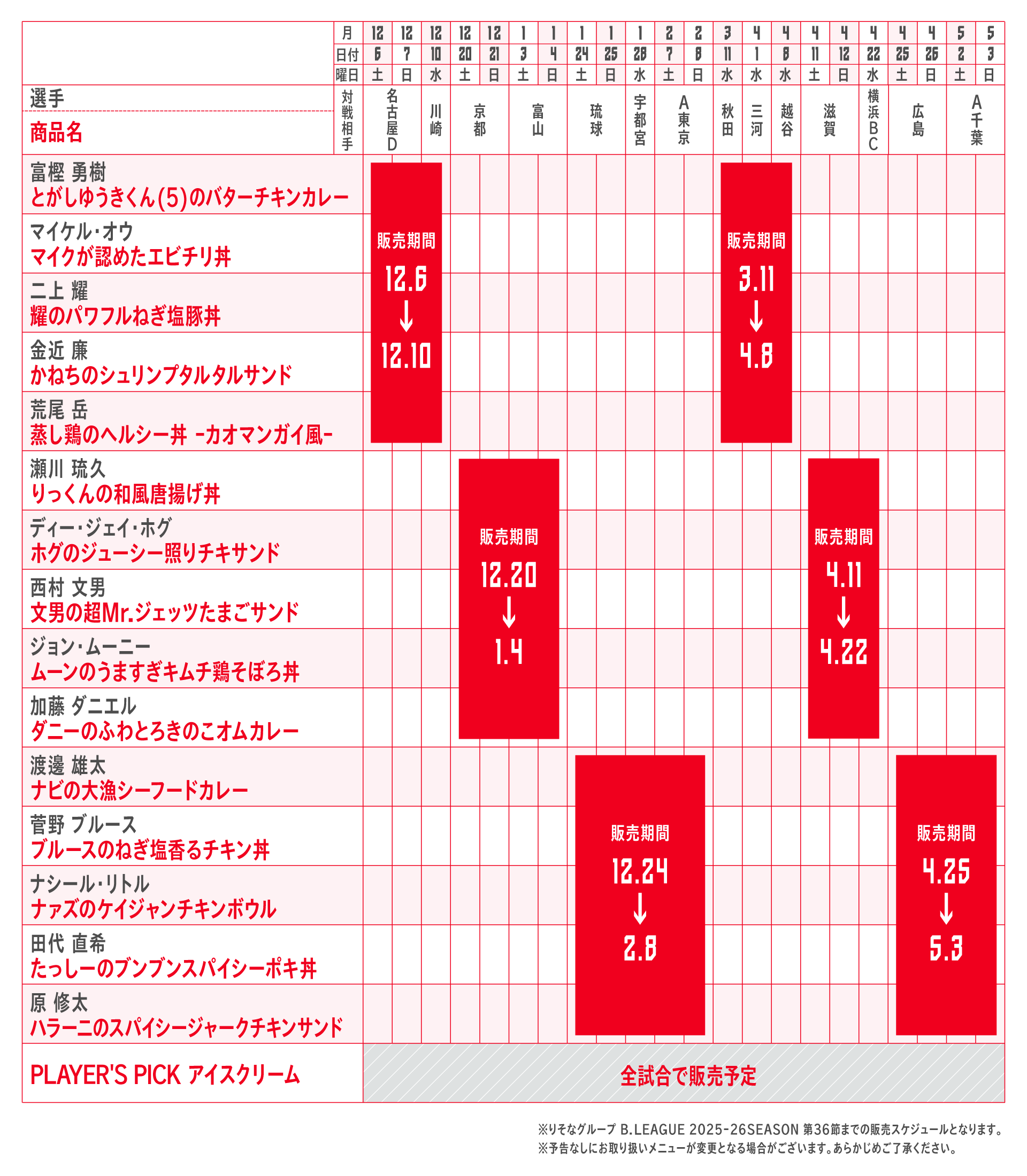 販売商品の詳細や販売場所は、各試合日のグルメ情報をご覧ください。