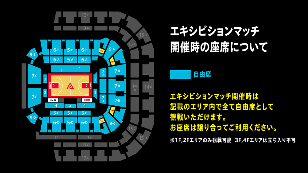 3F・4Fエリアのお客さまは、千葉ジェッツの試合終了後、規制退場時に1F・2Fエリアまでご移動のうえご観戦ください。