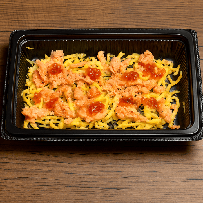 ふっくら炊き上げたご飯の上に錦糸卵と海苔を敷き、香ばしい鮭といくらをのせたはらこ飯風炊き込みご飯。