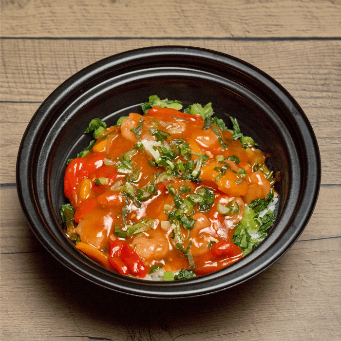 ぷりぷりのエビと旨辛チリソースのパンチがクセになるエビチリ丼です。ご飯がすすむこと間違いなし!