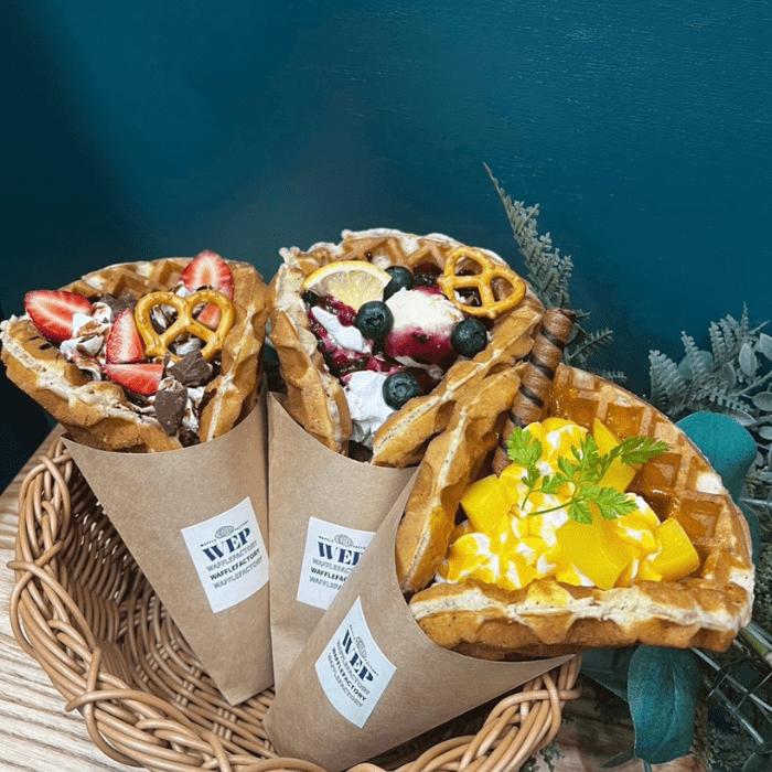 ワッフル専門店WEPから生まれた「ワッフルロール」。茶葉入りの薄焼きワッフルにフルーツやクッキーをトッピングした華やかさ抜群のオリジナルスイーツ。軽い食感で気付けばペロリと食べられるのも特徴!