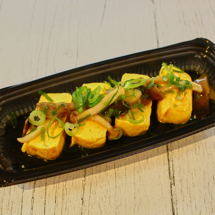 島根県の名産であるあごだしを使用しただし巻き玉子です。仕上げにあごだしとキノコの風味が効いた旨味たっぷりの餡をかけました。