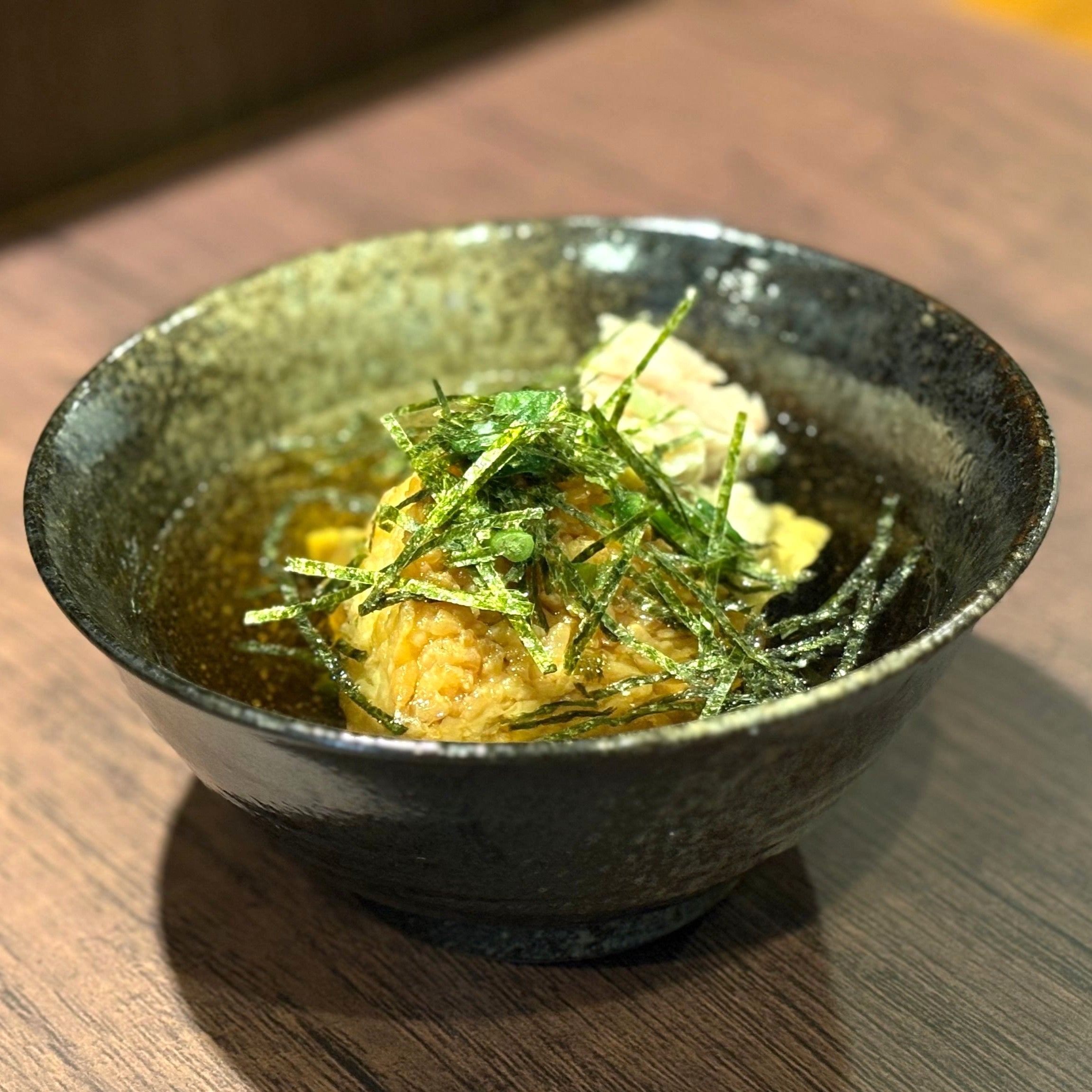 富山県の水産物のひとつとして親しまれているしじみ出汁を使用した出汁茶漬けです。お出汁をたっぷりと吸った唐揚げ入りで満足感のある一品。別添えの焼きおにぎりを崩し入れてお出汁と絡ませれば、しじみの自然な甘みと旨みが口いっぱいに広がります。