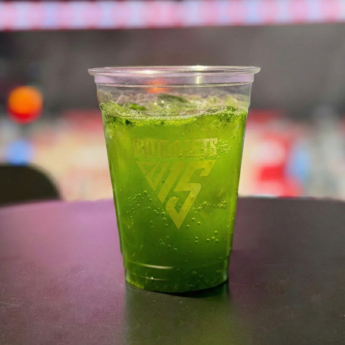 イチゴ味にゴロゴロフルーツ入り!ジェッツカラーのドリンクを飲んで応炎!