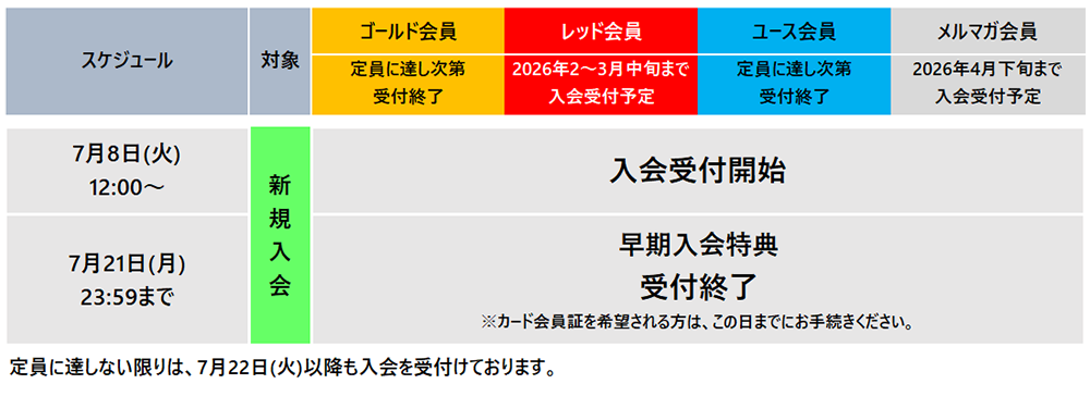 - 2 受付終了時期は、レッド会員は2026年2~3月頃、メルマガ会員は2026年4月頃を予定しております。ただし、入会状況によって前後する場合がございます。