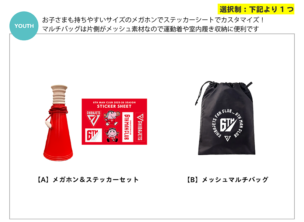 特典グッズの選択は、入会完了後にファンクラブマイページ(①B.LEAGUEチケット会員ページにログイン ②ファンクラブのクラブロゴを選択 ③入会アンケート)から2025年7月14日(月)までにご回答ください。(※3)