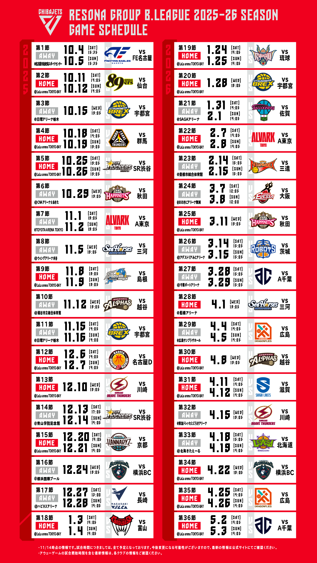 最新の情報は、千葉ジェッツふなばし公式サイトおよび対戦クラブの公式サイト等でご確認ください。