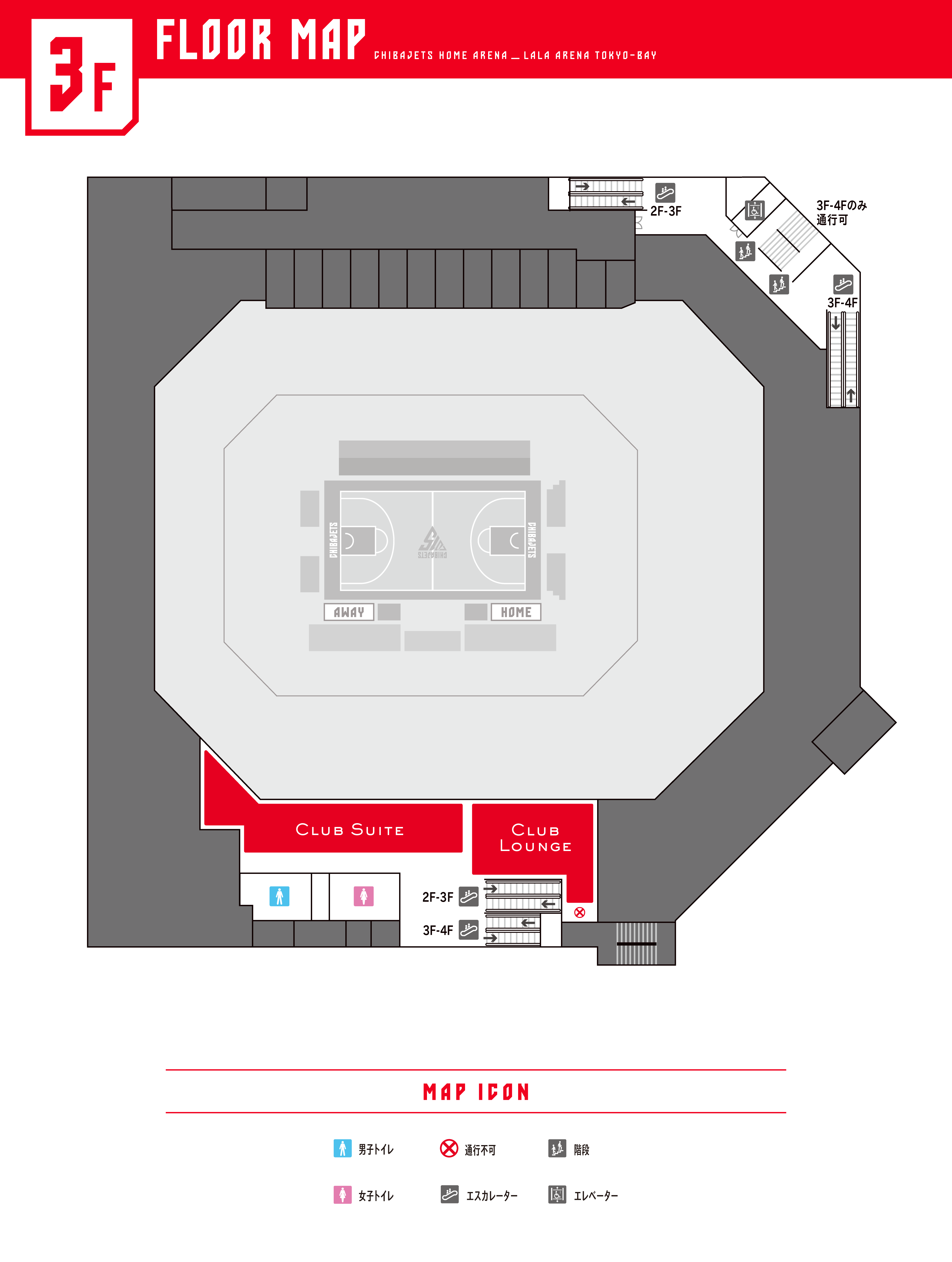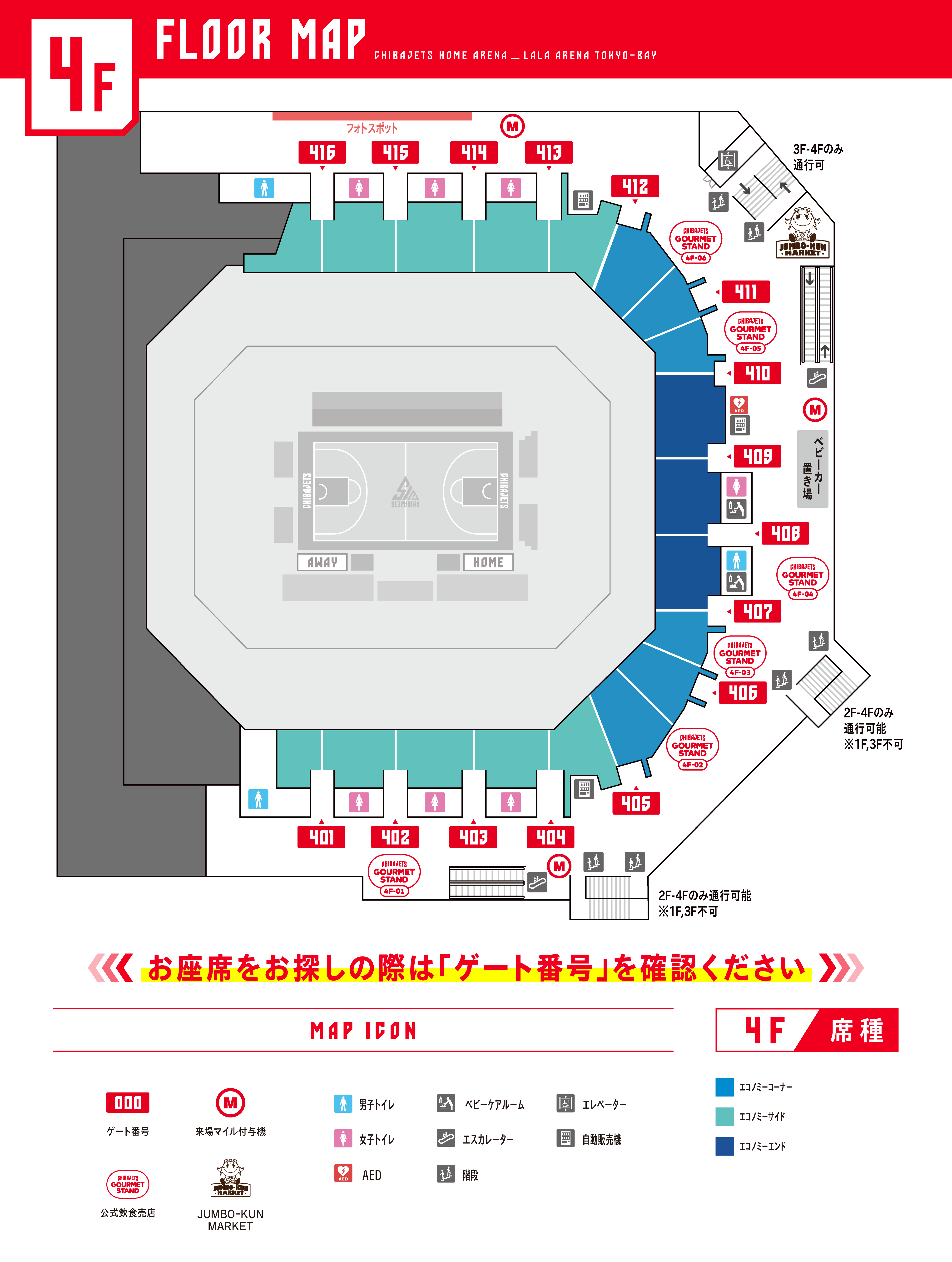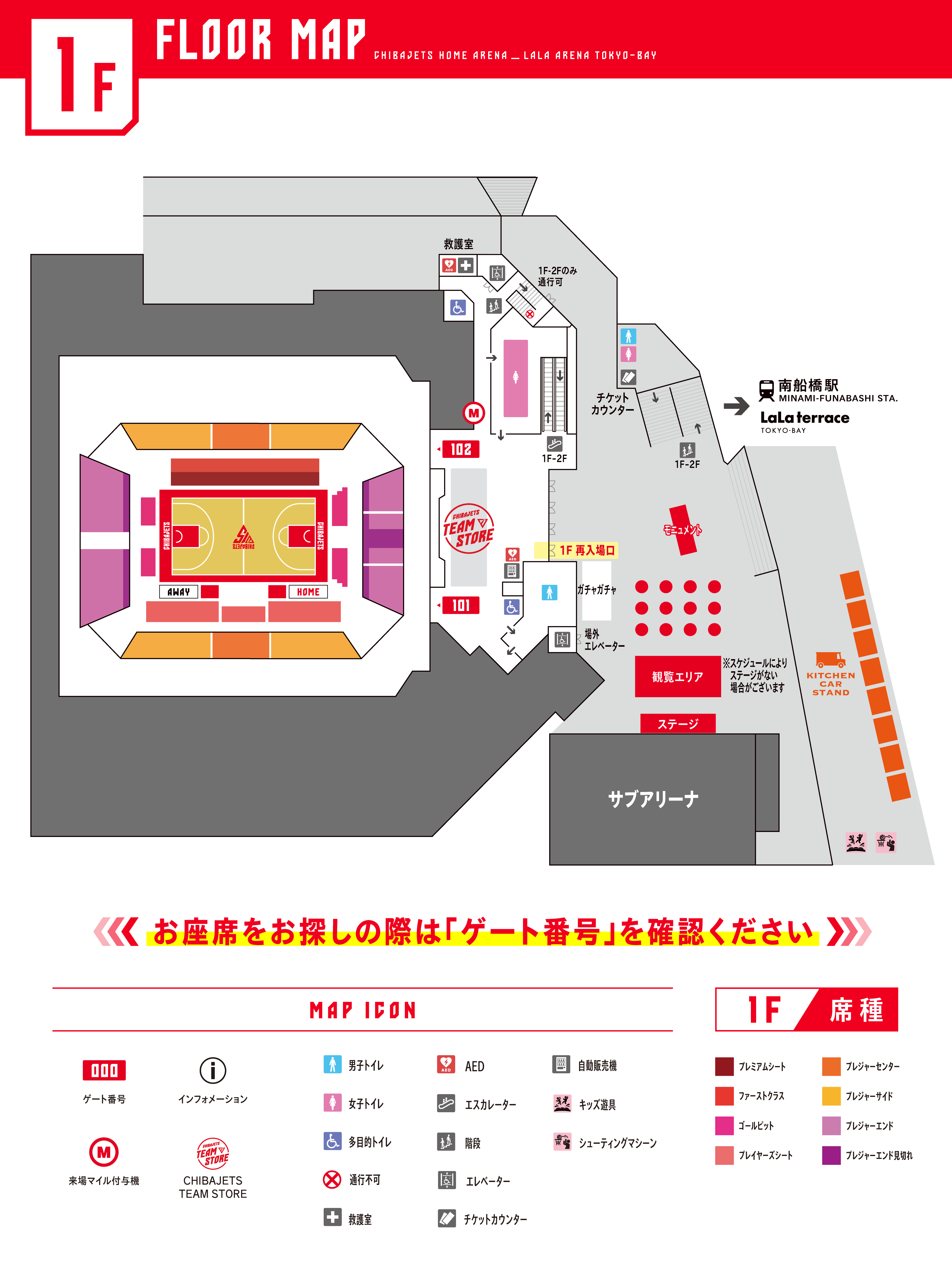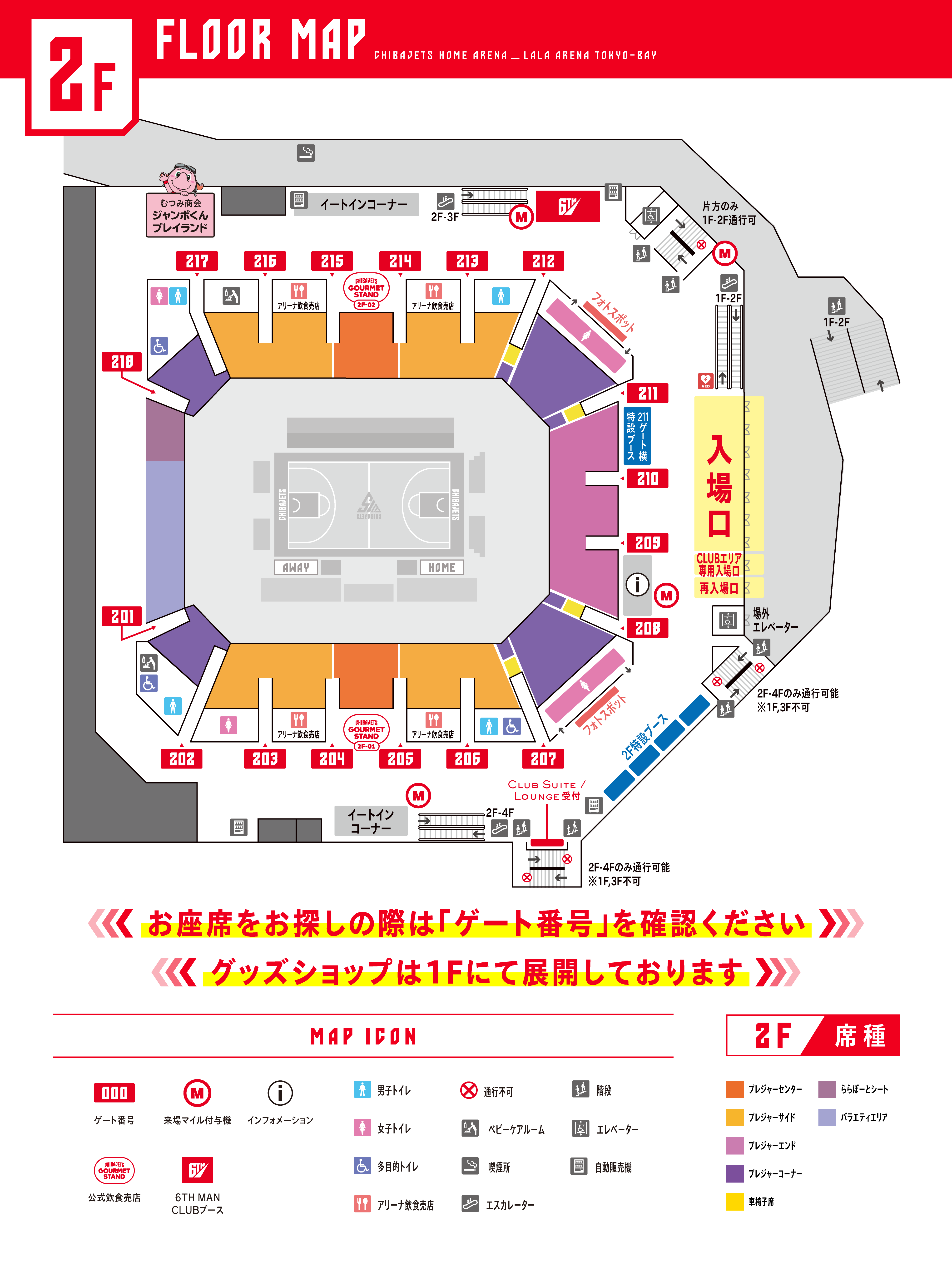 - 1F公式グッズ販売店舗「CHIBAJETS TEAM STORE」へ向かう場合は、2F出入口から退場せず、場内の階段またはエスカレーターをご利用ください。