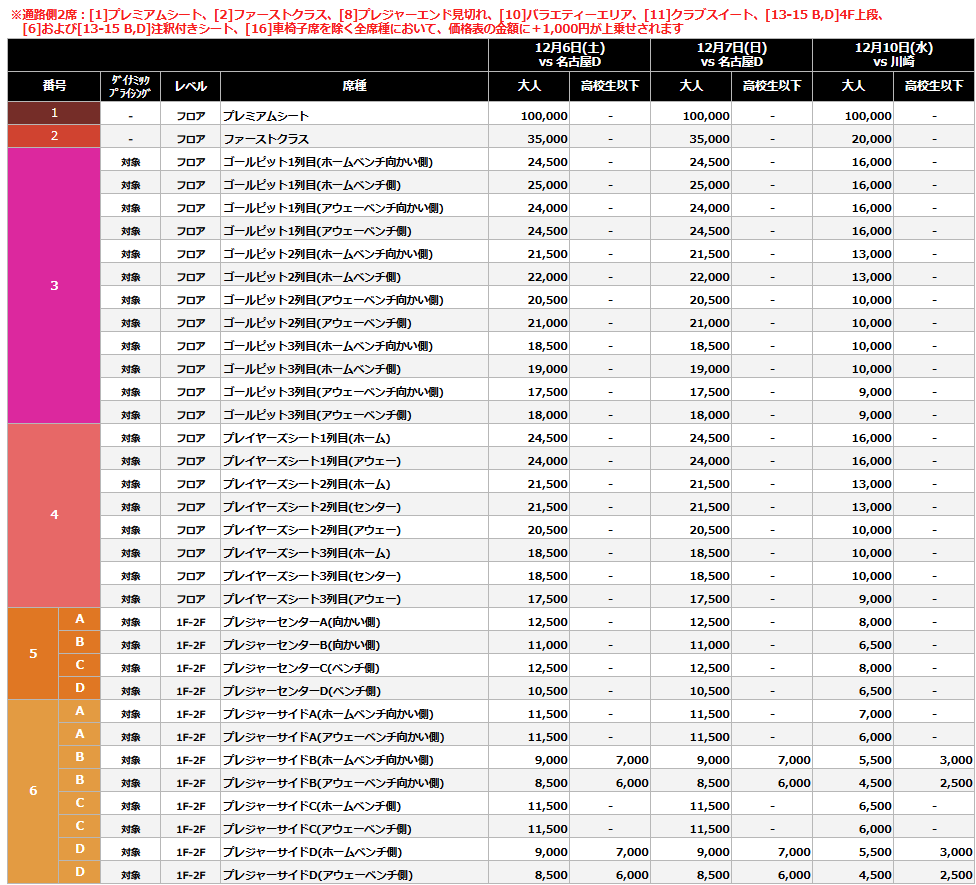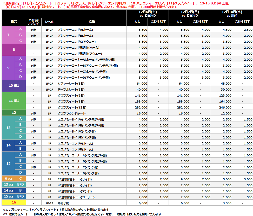 ・プレミアムシート、ファーストクラス、バラエティーエリア、クラブスイート、プレジャーエンド見切れ、4F上段の席種、車椅子席、高校生以下の価格設定席種は、試合ごとの固定価格となります。