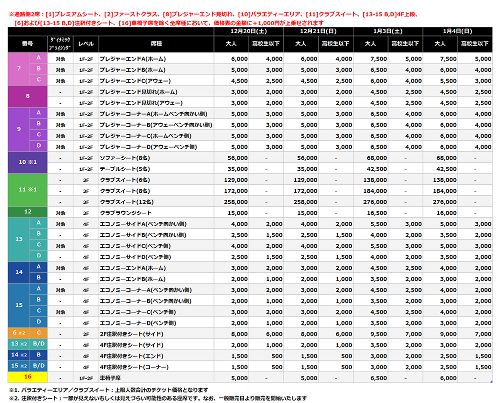 ・プレミアムシート、ファーストクラス、バラエティーエリア、クラブスイート、プレジャーエンド見切れ、4F上段の席種、車椅子席、高校生以下の価格設定席種は、試合ごとの固定価格となります。