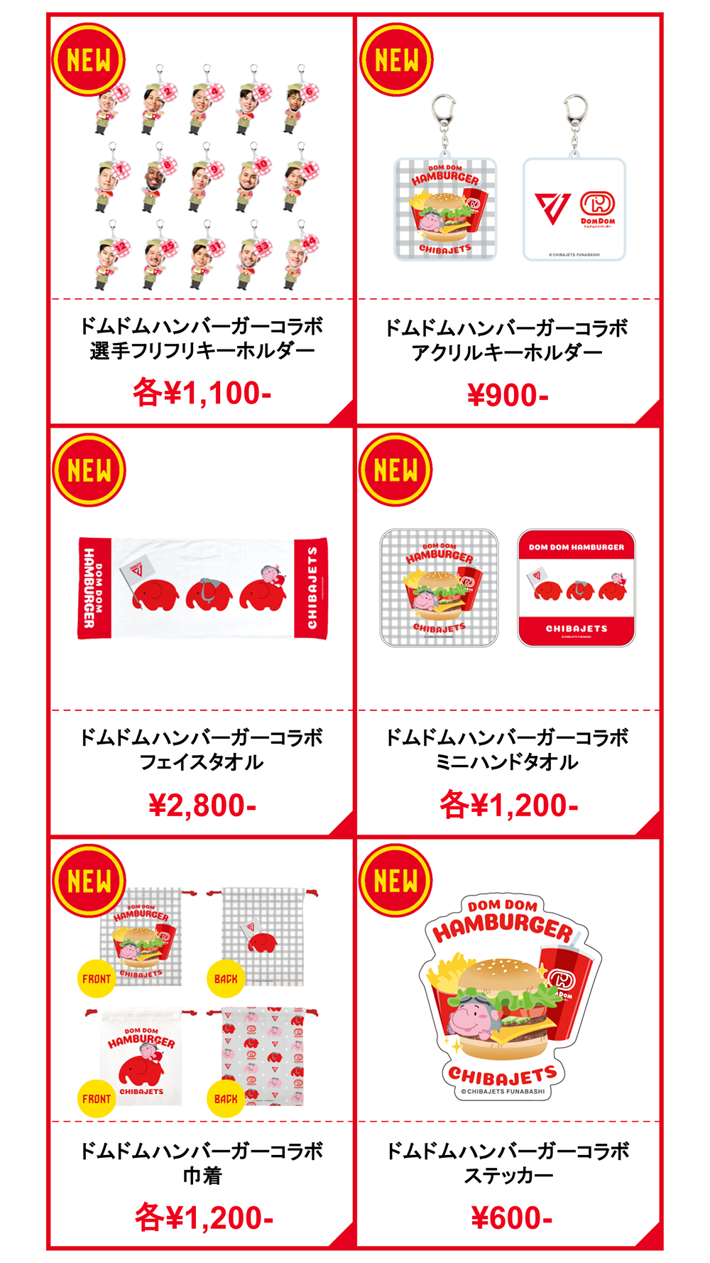 千葉ジェッツの選手たちが、ドムドムハンバーガーの店員さん衣装に身を包んだ「フリフリキーホルダー」もラインナップ。手に持っているものの種類も注目ポイント!