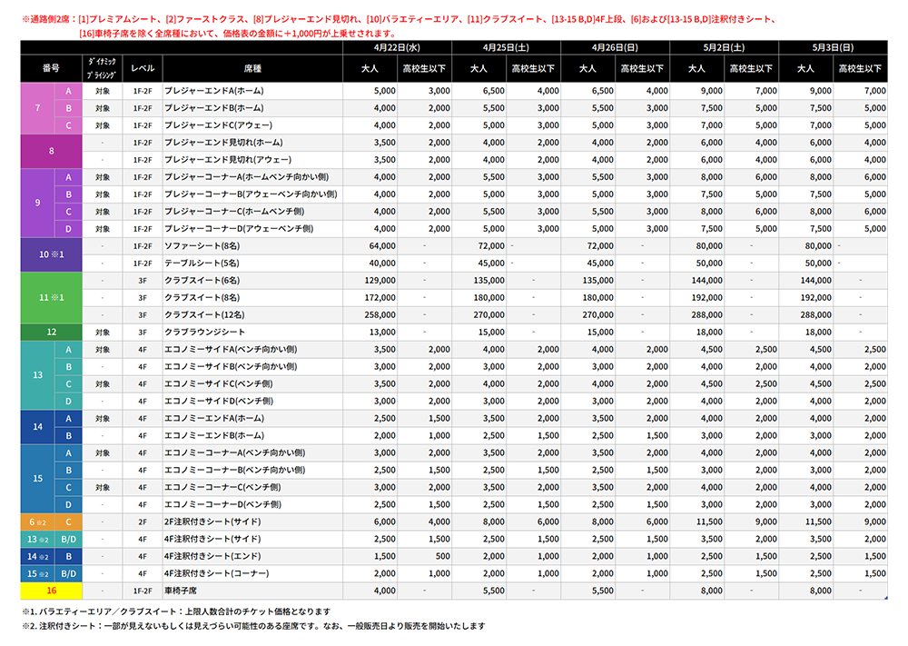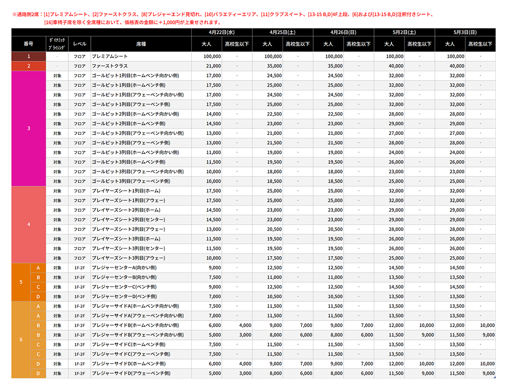 - プレミアムシート、ファーストクラス、バラエティーエリア、クラブスイート、プレジャーエンド見切れ、4F上段の席種、車椅子席、高校生以下の価格設定席種は、試合ごとの固定価格となります。