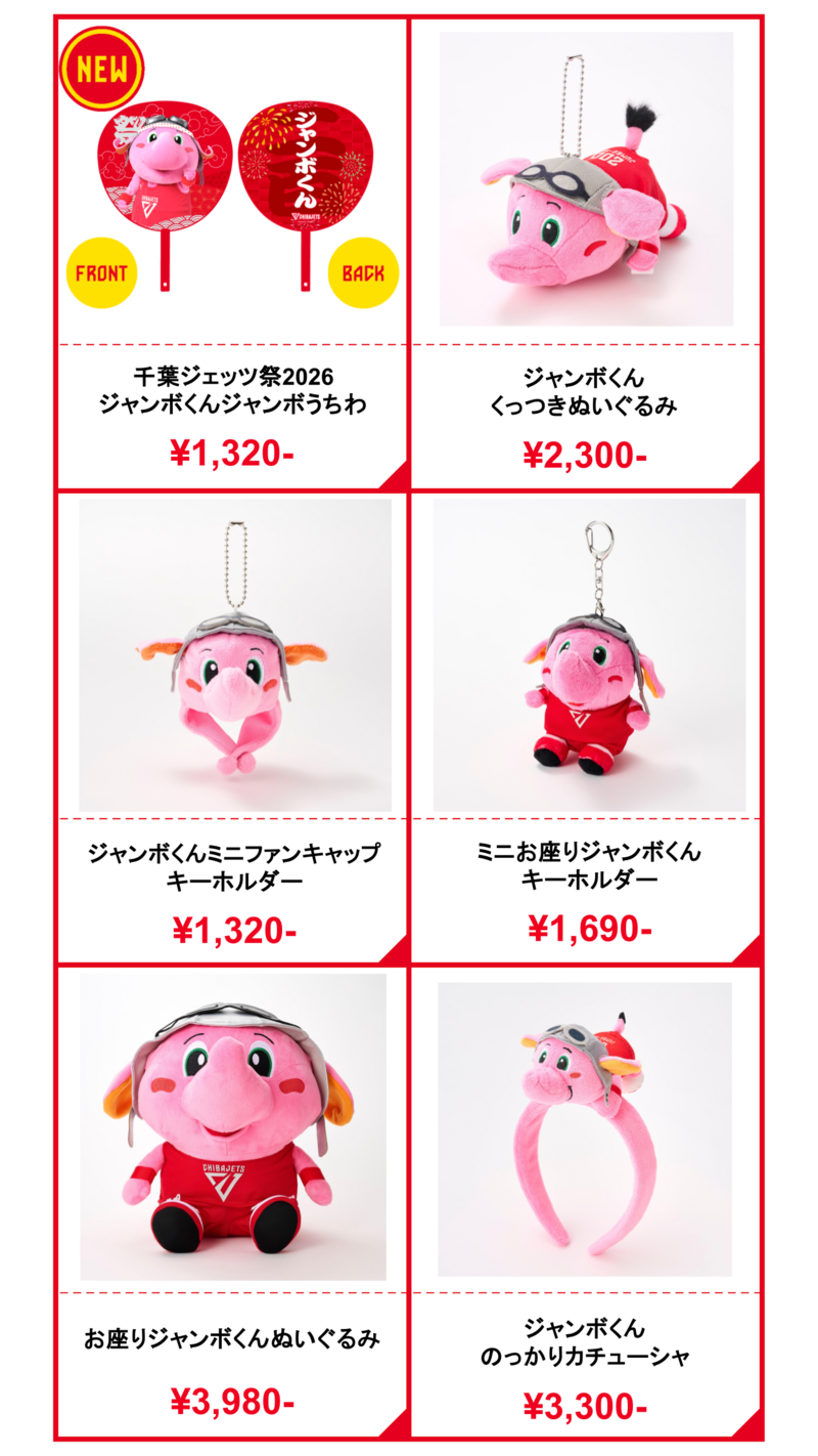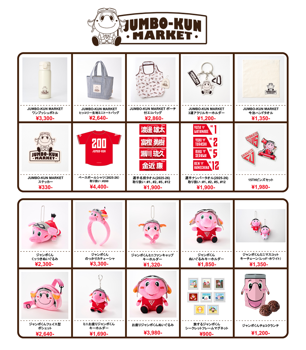 また、ジャンボくんは選手とお揃いビジュアルのジャンボうちわも登場!普段使いしやすい巾着、ハンドタオルもございます