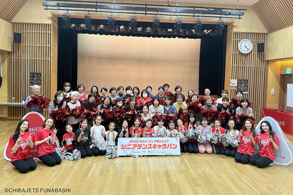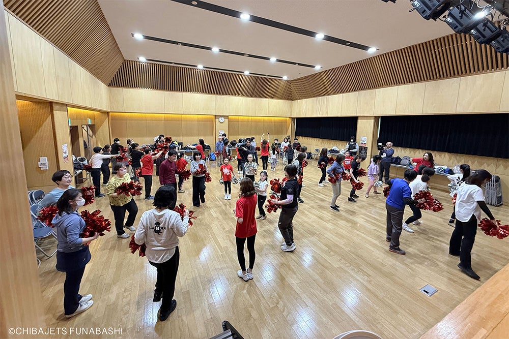 当日は、近隣にお住まいのシニア世代の参加者32名と千葉ジェッツチアリーディングスクール生が参加し、「千葉ジェッツの歌」に合わせたダンスエクササイズを行いました。スクール生も共に参加することで、世代を超えた交流の場となり、とても和やかな雰囲気の中での活動となりました。年齢問わず楽しめるチアダンスの可能性を改めて感じ、充実した時間を過ごすことができました。